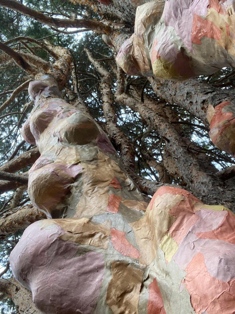"Pour l’Arboretum de Roure, la sculpture en fibre ne peut être exposée pour des raison écolo. J’ai donc recréé les seins en papier naturel, reconstruits feuille par feuille à partir du modèle existant. Ils sont collés directement sur les troncs des arbres", Nathalie Broyelle.