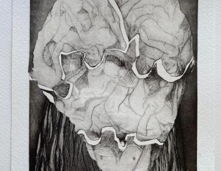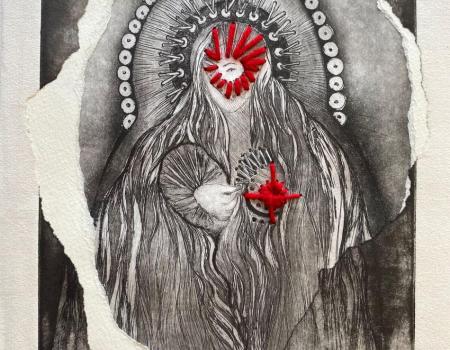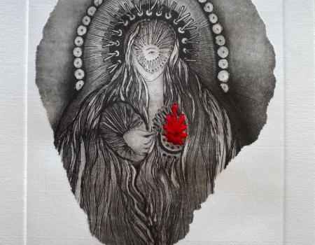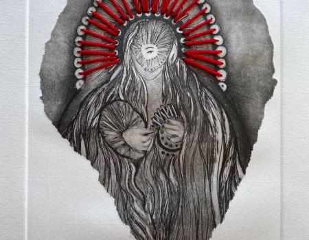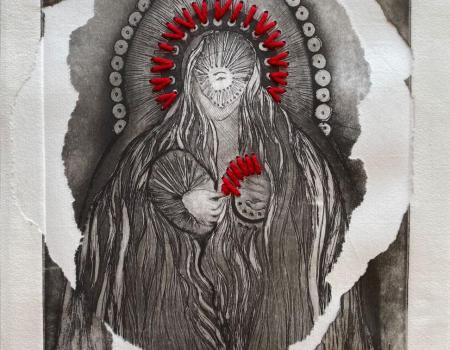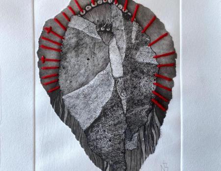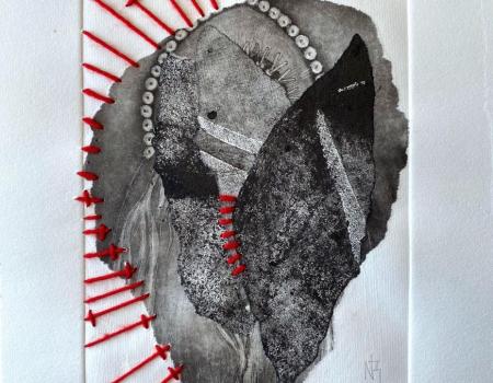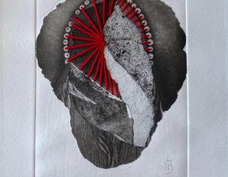 Utilisant ici la technique de la gravure sur cuivre comme médium, nathalie intègre aussi des éléments de couture avec de la laine rouge, un symbole de blessure et de réparation.