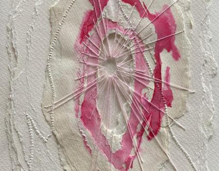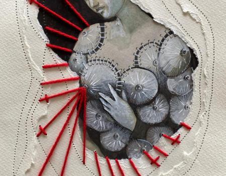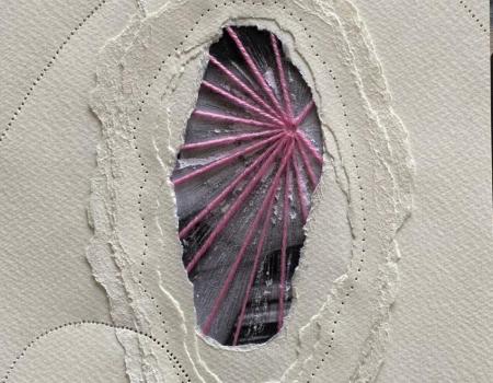 Le choix de la couture et du papier déchiré est significatif. La couture, traditionnellement associée au féminin et à la réparation, devient ici un acte de reconstruction, une manière de suturer les plaies, tant physiques qu'émotionnelles. Le papier déchiré, quant à lui, symbolise la fragilité et l'éphémère, mais aussi la possibilité de créer quelque chose de nouveau à partir des fragments du passé. L'acte de déchirer puis de recoudre ces matériaux reflète la dualité de l'œuvre : destruction et création, douleur et guérison.