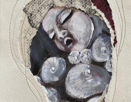 Les Saintes Agathe, en référence à Sainte Agathe de Catane, une martyre chrétienne du IIIe siècle, symbolise la résistance face à la violence et à l'oppression. Dans la tradition chrétienne, Sainte Agathe est souvent représentée avec ses seins sur un plateau, en mémoire du supplice qu'elle a subi. Nathalie Broyelle revisite cette iconographie avec une sensibilité contemporaine, utilisant la couture et le papier déchiré pour évoquer à la fois la souffrance et la résilience.